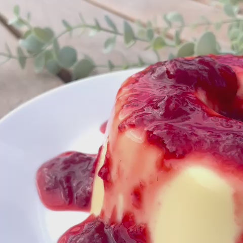 The pudding is made with premium white chocolate and handcrafted topping with fresh strawberries.